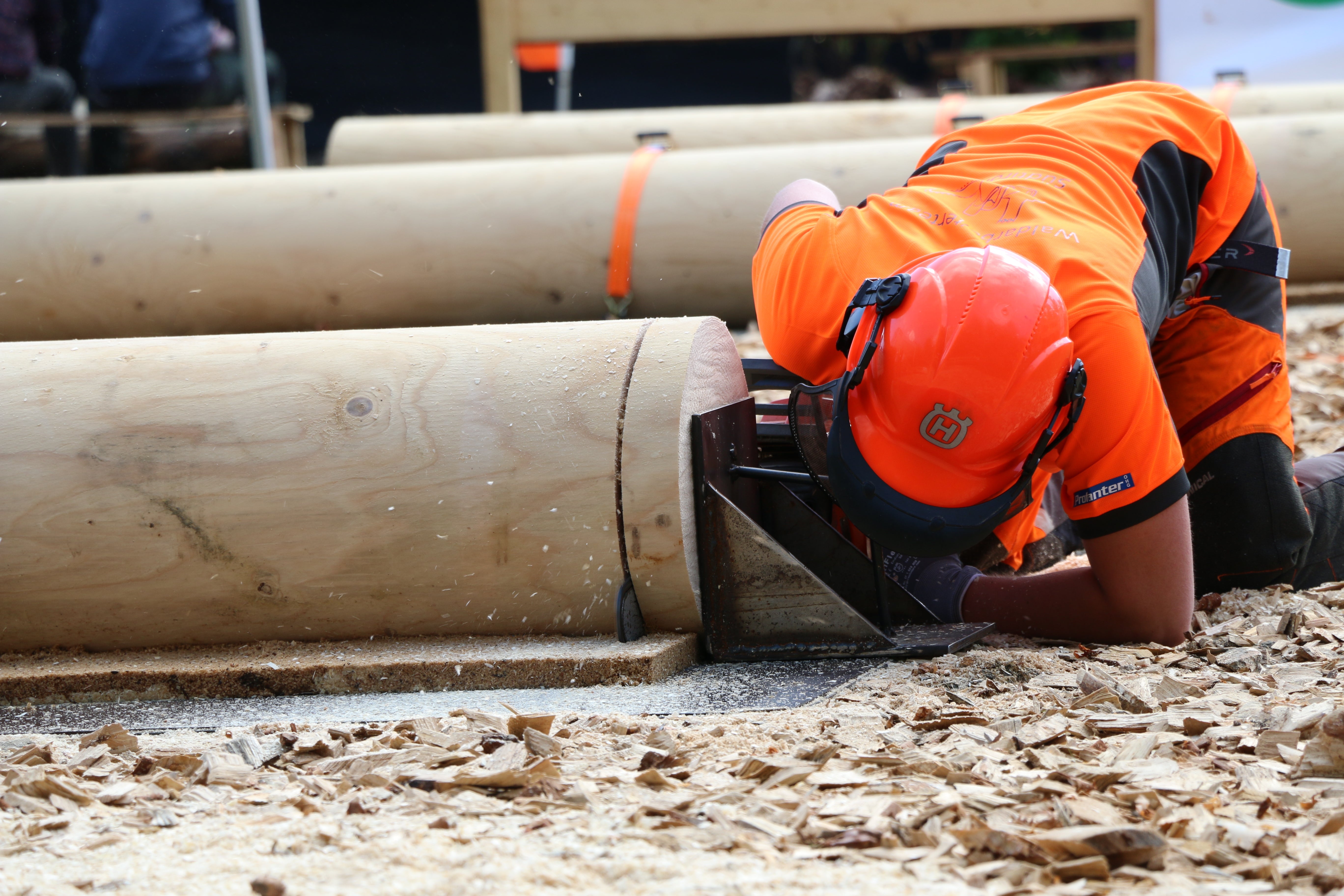 Il partecipante deve tagliare da ciascuno dei due tronchi un disco di legno che non può essere più sottile di 3 cm e più spesso di 8 cm. Inoltre deve tagliare sui due tronchi dapprima la prima metà da sotto fino alla fascia di colore rosso, poi il resto da sopra. Il taglio in ogni tronco deve essere effettuato perpendicolarmente all’asse longitudinale del legno