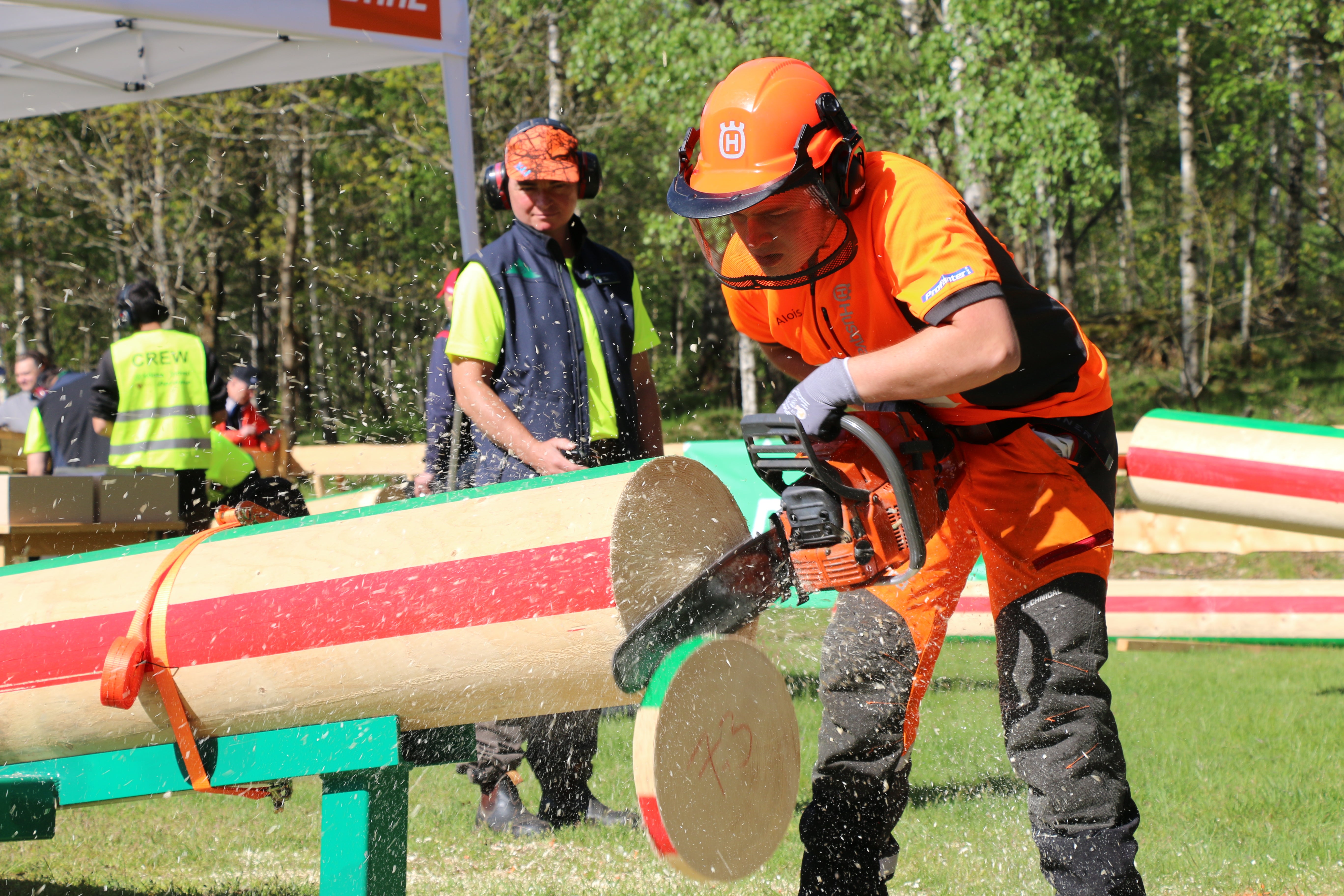 From two logs, one must cut a disc of wood no thinner than 30 mm and no thicker than 80 mm. This must be done by cutting the first half upwards from beneath the log and the second half from the top. The contestant gets the highest points when the upper and downward cuts meet each other, without a step, within the marked red zone and at right-angles to the length of the log.