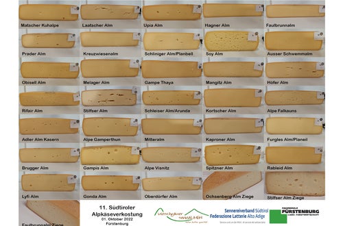 36 Alpkäse, 33 aus Kuhmilch und 3 aus Ziegenmilch, von 33 Almen aus Südtirol und der Terra Raetica Region standen zur Verkostung bereit.