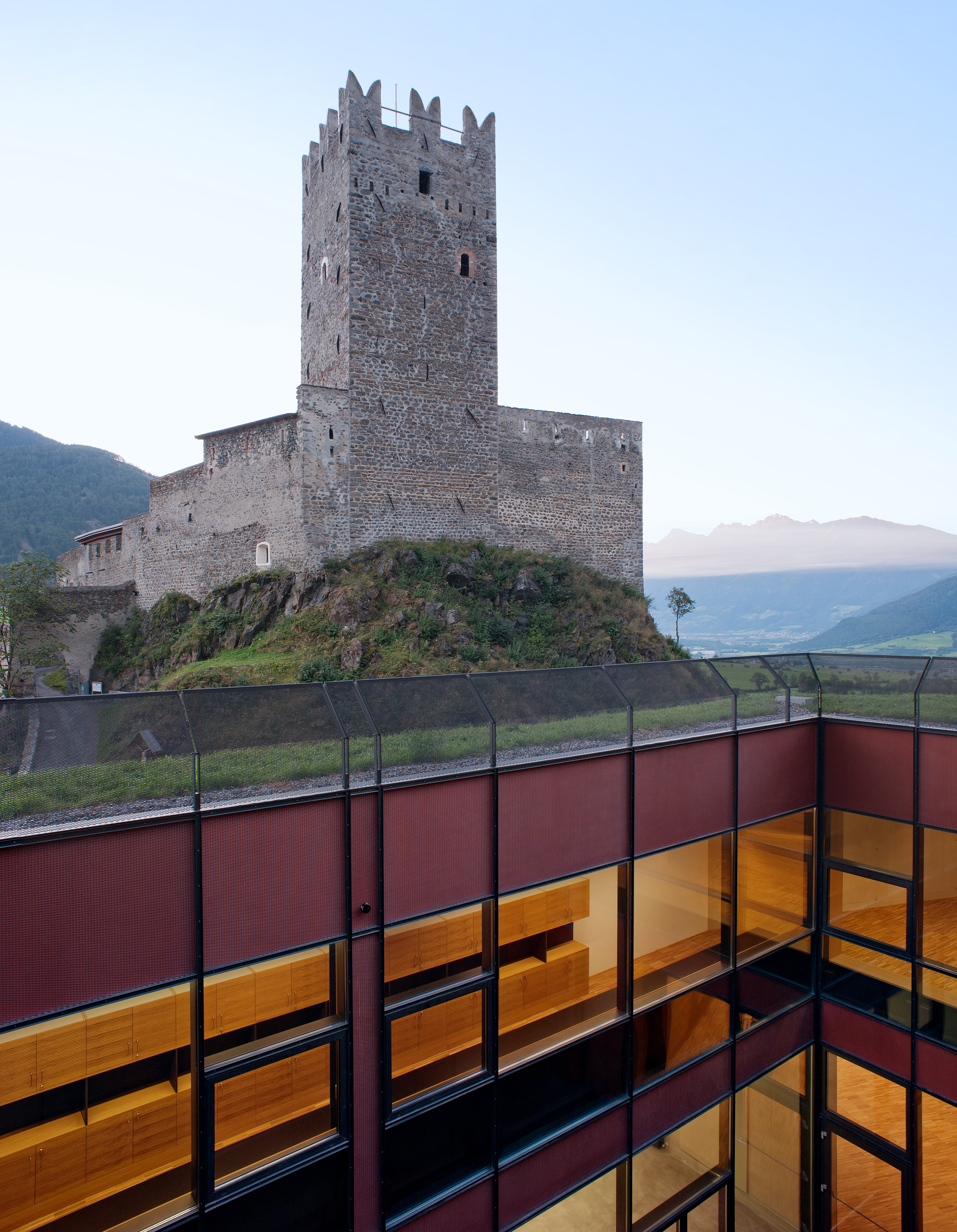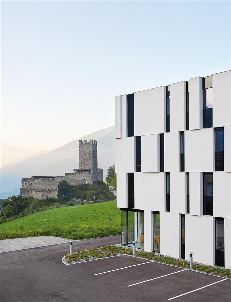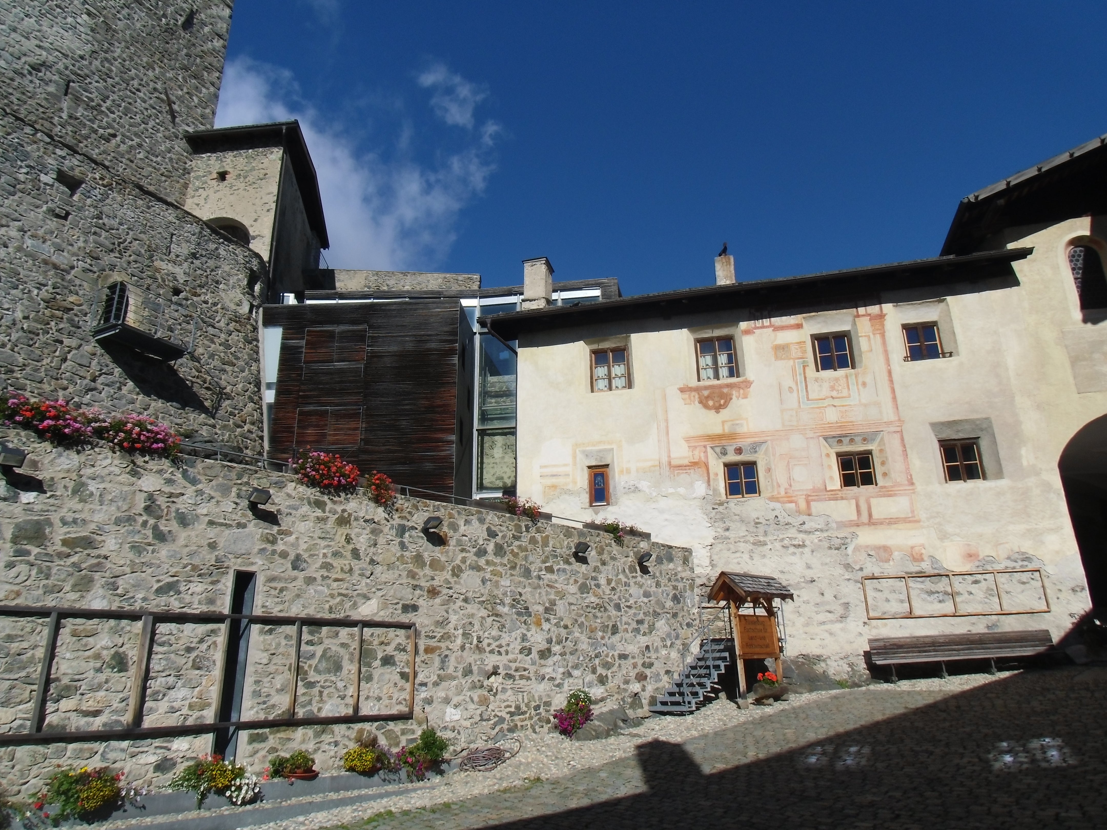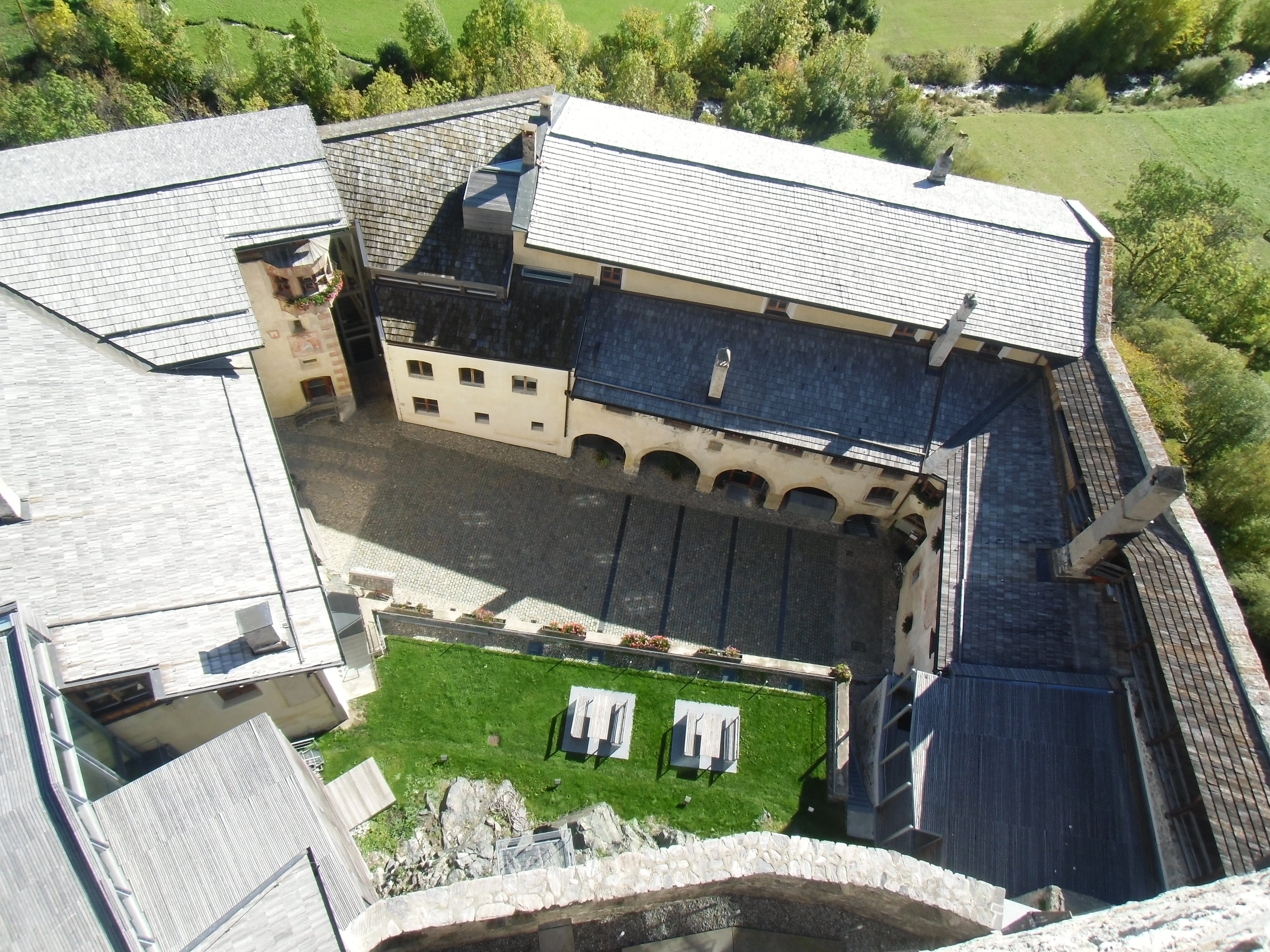 Gleich mehrere Gebäude umfasst das Areal unserer Schule. Dabei fallen jedem sofort die alten Mauern und der, mit seinen markanten Zacken, in die Luft ragende Turm ins Auge. Seit dem Jahr 2011 haben wir dazu ein neues Schulgebäude direkt, wenn auch etwas versteckt, neben der Fürstenburg. Darin finden sich weitere Klassenräume, Werkhallen, eine hauseigene Schul-Sennerei, eine Aula Magna für Veranstaltungen und Tagungen und ein neuer EDV-Raum.