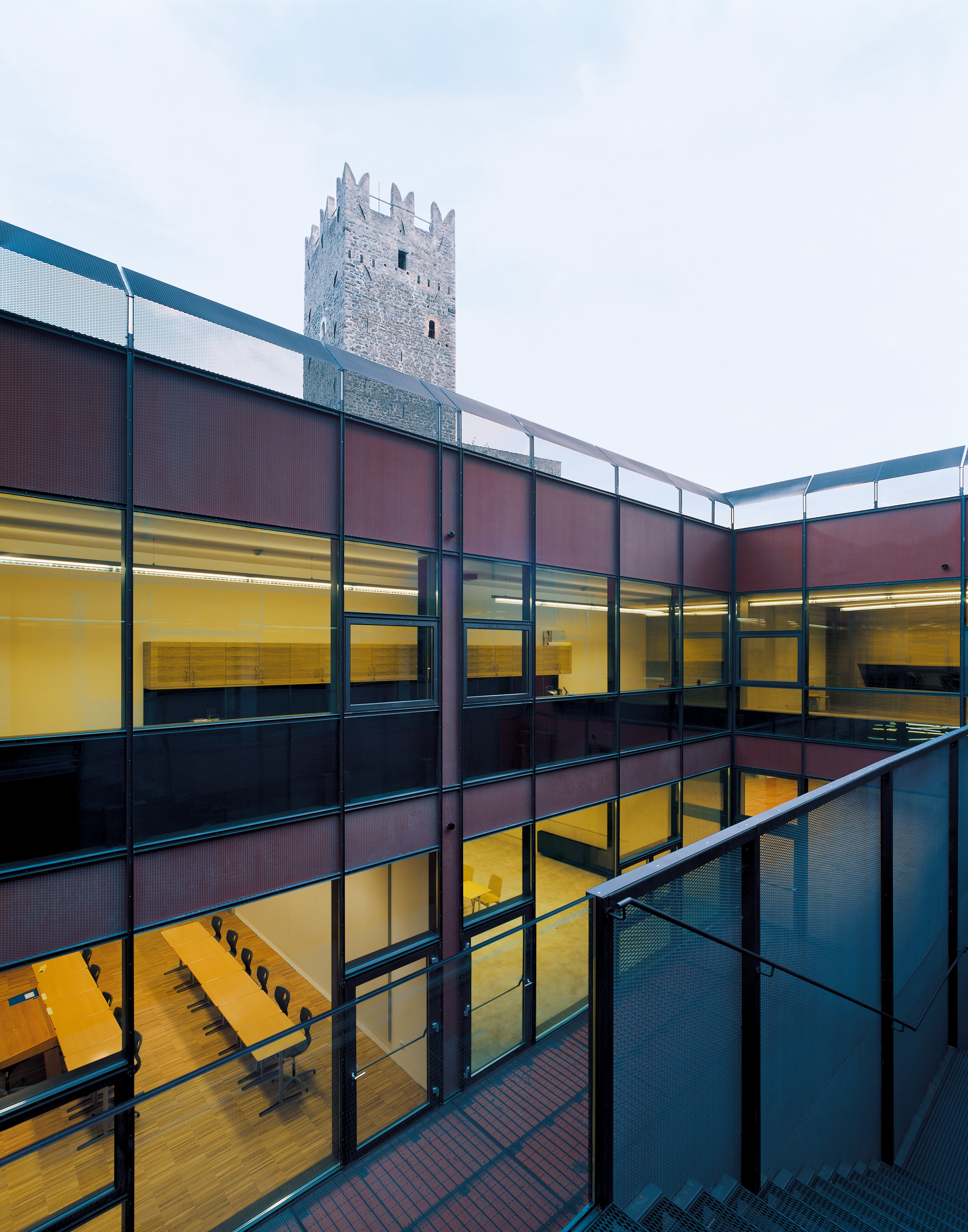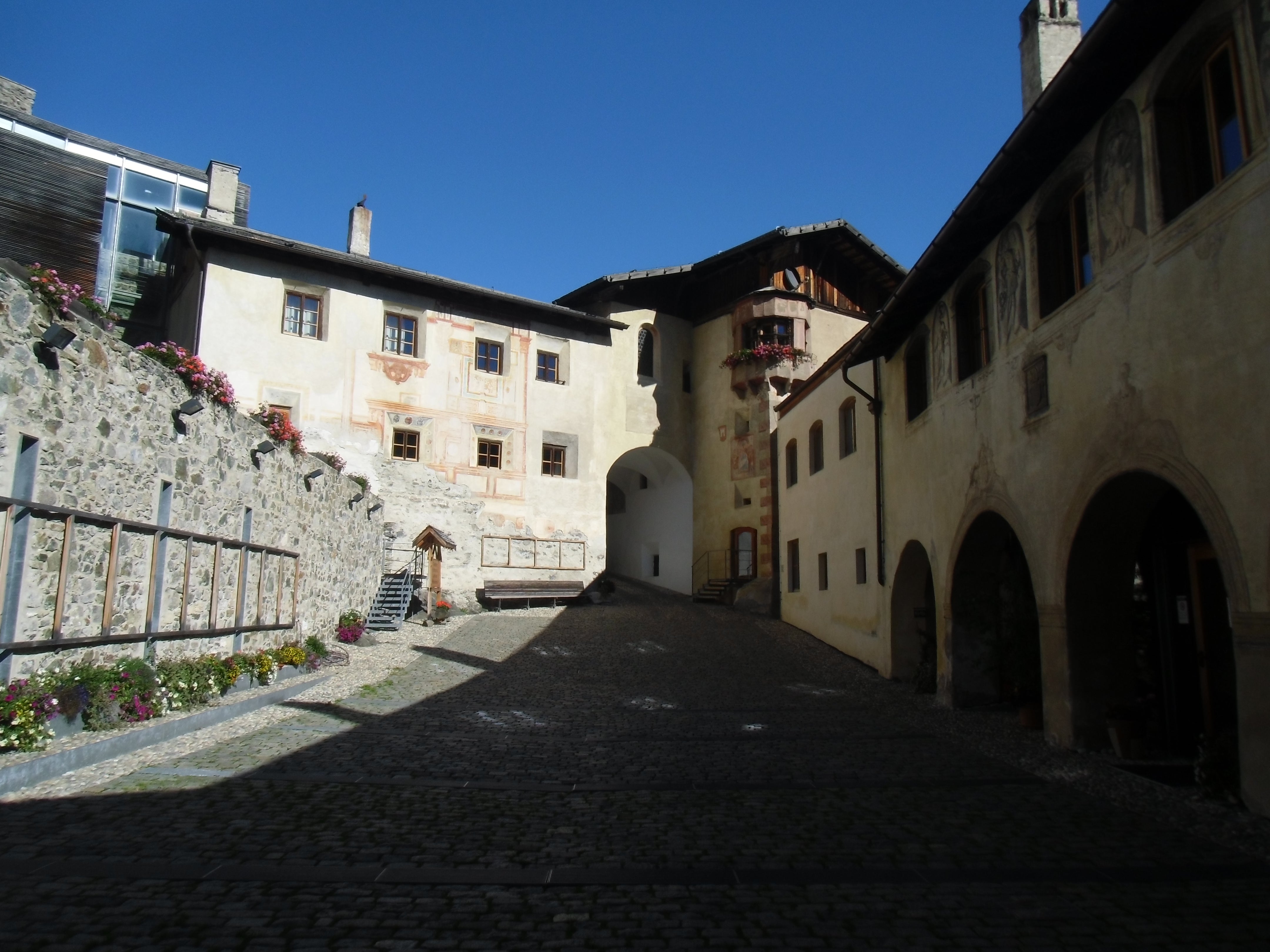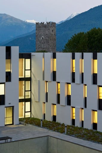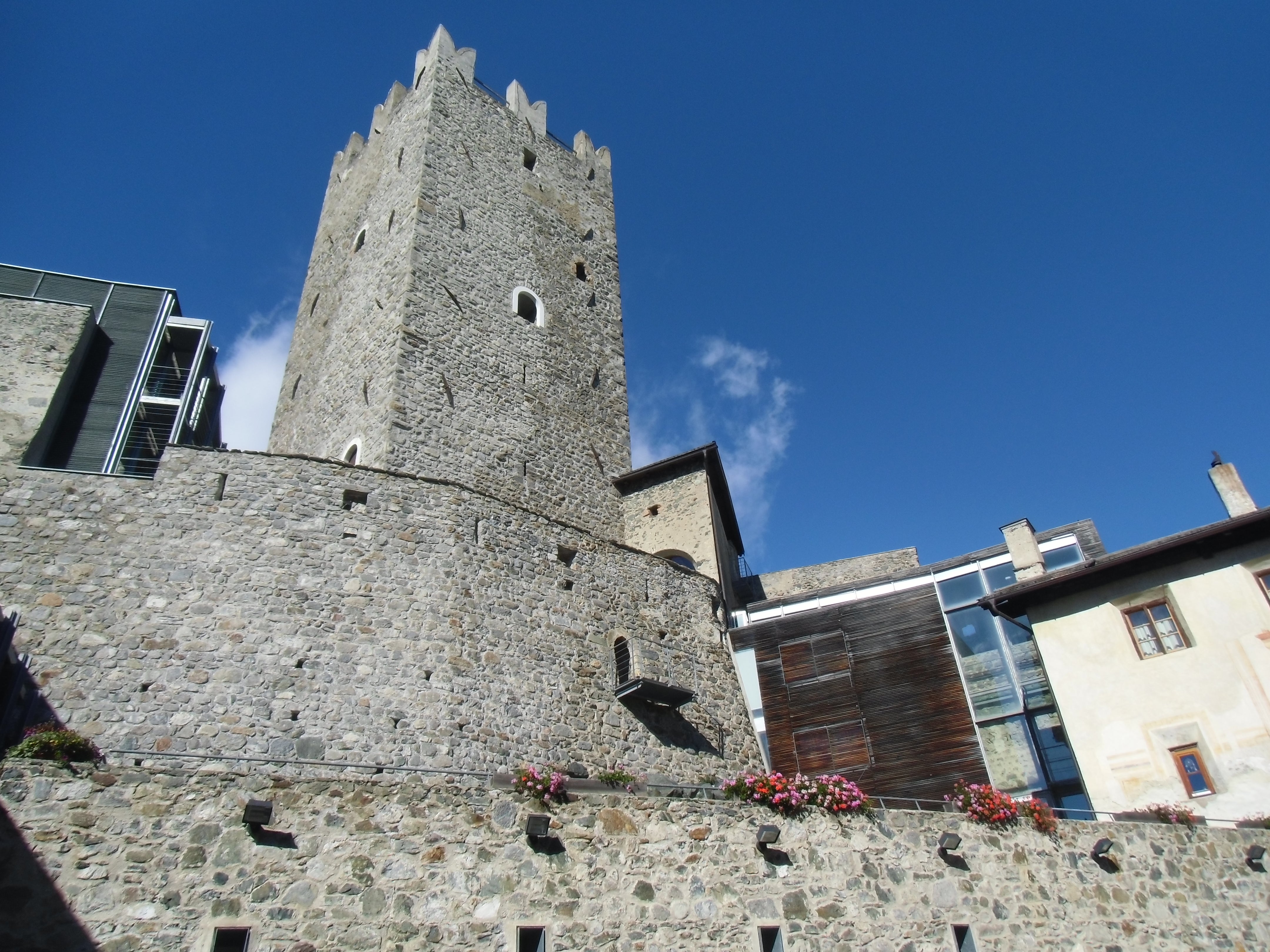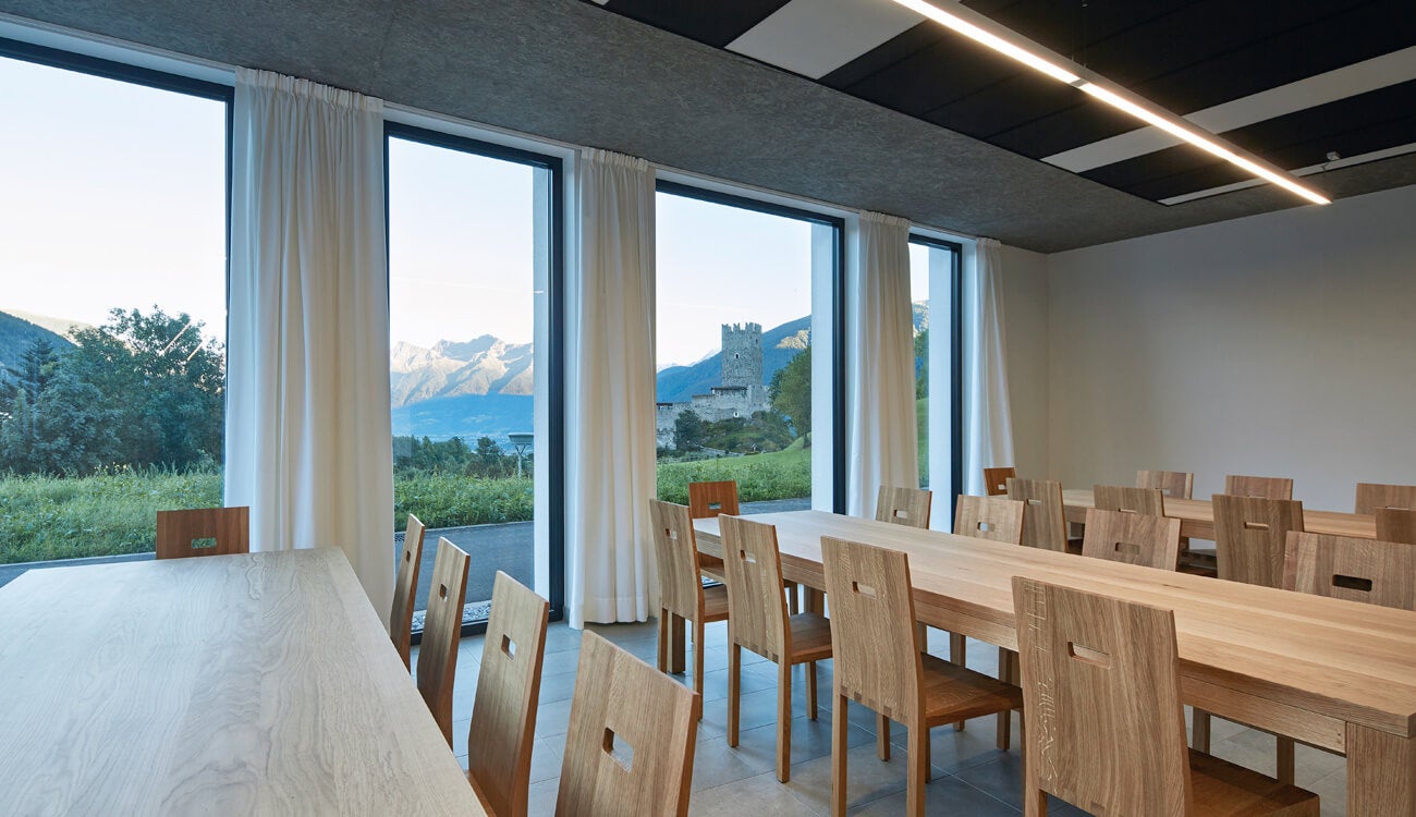 Gleich mehrere Gebäude umfasst das Areal unserer Schule. Dabei fallen jedem sofort die alten Mauern und der, mit seinen markanten Zacken, in die Luft ragende Turm ins Auge. Seit dem Jahr 2011 haben wir dazu ein neues Schulgebäude direkt, wenn auch etwas versteckt, neben der Fürstenburg. Darin finden sich weitere Klassenräume, Werkhallen, eine hauseigene Schul-Sennerei, eine Aula Magna für Veranstaltungen und Tagungen und ein neuer EDV-Raum.